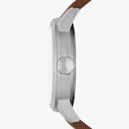 This men’s analog watch is designed with a brown leather strap that offers comfort and a secure fit. The round stainless steel case frames a clean, easy-to-read dial with classic analog display. Built with quartz movement, this watch provides reliable timekeeping and a versatile style that works well for both casual and formal wear.”