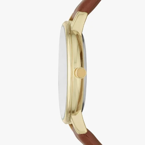 This men’s classic analog watch combines a brown leather strap with a gold-tone dial for a timeless appearance. The stainless steel case offers durability, while the quartz movement ensures precise timekeeping. Its versatile design makes it suitable for both casual outings and formal occasions.”